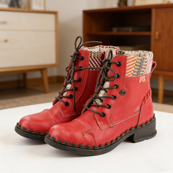The contrasting fabric label on the cuff, embroidered stitching on the side, mint-green trim by the zipper, even the eyelets are vintage silver buckles—it’s like wearing handmade market texture on your feet✨ The soft leather lining at the collar feels warm when brushing against your ankle; detail freaks are totally "hooked."