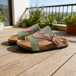 Who says comfort canât be stylish? This sandalâs playful sage green and dusty rose color block is a breath of fresh air in a sea of boring neutral slides. The soft, textured leather adds a vintage-inspired charm, while the subtle contrast stitching and decorative lace detail on the strap bring a thoughtful, artisanal touch. Itâs the perfect balance of eye-catching and understated: pair it with jeans, a sundress, or even linen shorts, and it elevates every outfit effortlessly. This isnât just a summer shoeâitâs a statement piece that works for every casual occasion.